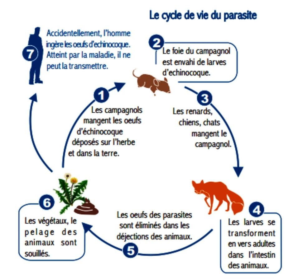 l’Homme se fait contaminer par l’ingestion d’œufs d’Echinococcus multilocularis lors de contacts directs avec l’animal infecté, ou indirects par le biais de ses excréments ayant souillé la végétation environnante.