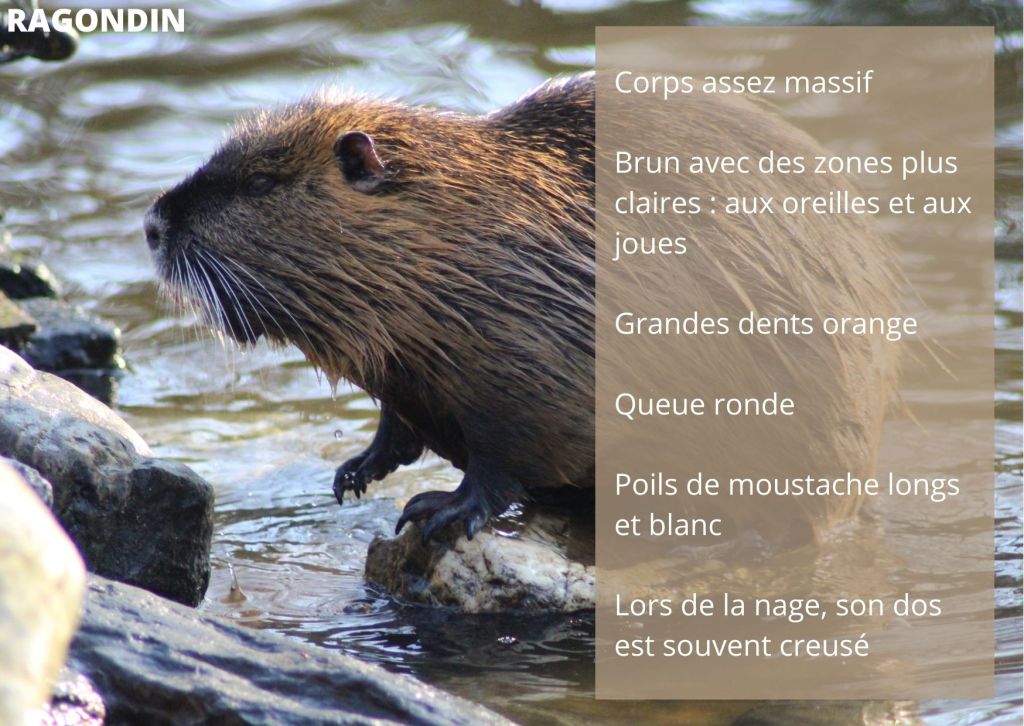 Le ragondin possède un pelage gris-brun, mais il est plus massif que son compère. Sa taille peut varier entre 60 cm et 1 m, en comptant sa queue qui elle peut mesurer entre 30 et 40 cm. Le poids de cet animal est par conséquent plus élevé et peut donc peser entre 6 à 10 kg.